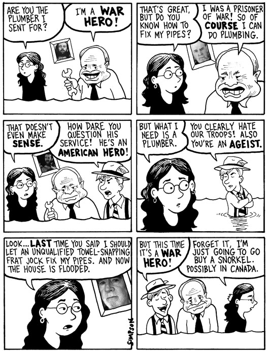 McCain seems to commit large factual errors almost every day. He claimed we'd drawn troop levels down to pre-surge levels, and when Obama pointed out that we haven't (there are currently 150,000 U.S. troops in Iraq, 20,000 more than there were in January 2007 before the "surge" started), instead of correcting himself and moving on, McCain dug in his heels and accused the Obama camp of being pedantic and quibbling over "verb tenses." (Seriously, verb tenses? Then what is he claiming he was trying to say? That at some future date we will have drawn down to pre-surge levels? That we were at pre-surge levels in the past, prior to the surge?)